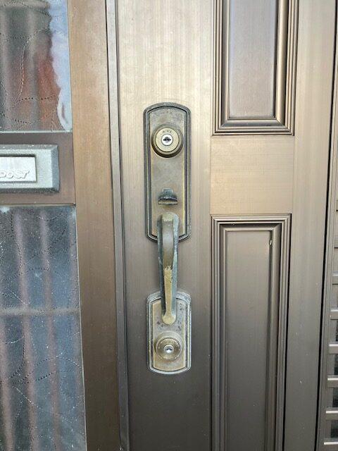玄関扉は木目調で落ち着いたデザインをしており、築十数年が経過しているものの手入れが行き届いていて、どこか温かみを感じさせました。既存のカギは一般的なピンシリンダーで、経年によるわずかな摩耗も見受けられました。これから新しい家族が住むことを考えると、防犯面の強化はぜひとも必要な状態でした。
