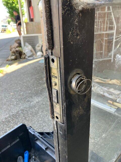店舗入口の扉を詳しく確認すると、シリンダーは頑丈な防犯タイプで、鍵穴は残されているものの、手元には一本も鍵がありませんでした。この状況では通常の方法での解錠は不可能と判断せざるを得ません。そこで、K.T様に破壊開錠の必要性と、同タイプの新品シリンダーへの交換について改めて丁寧にご説明しました。状況を理解されたK.T様は安心された様子で了承され、そのまま作業を開始することとなりました。